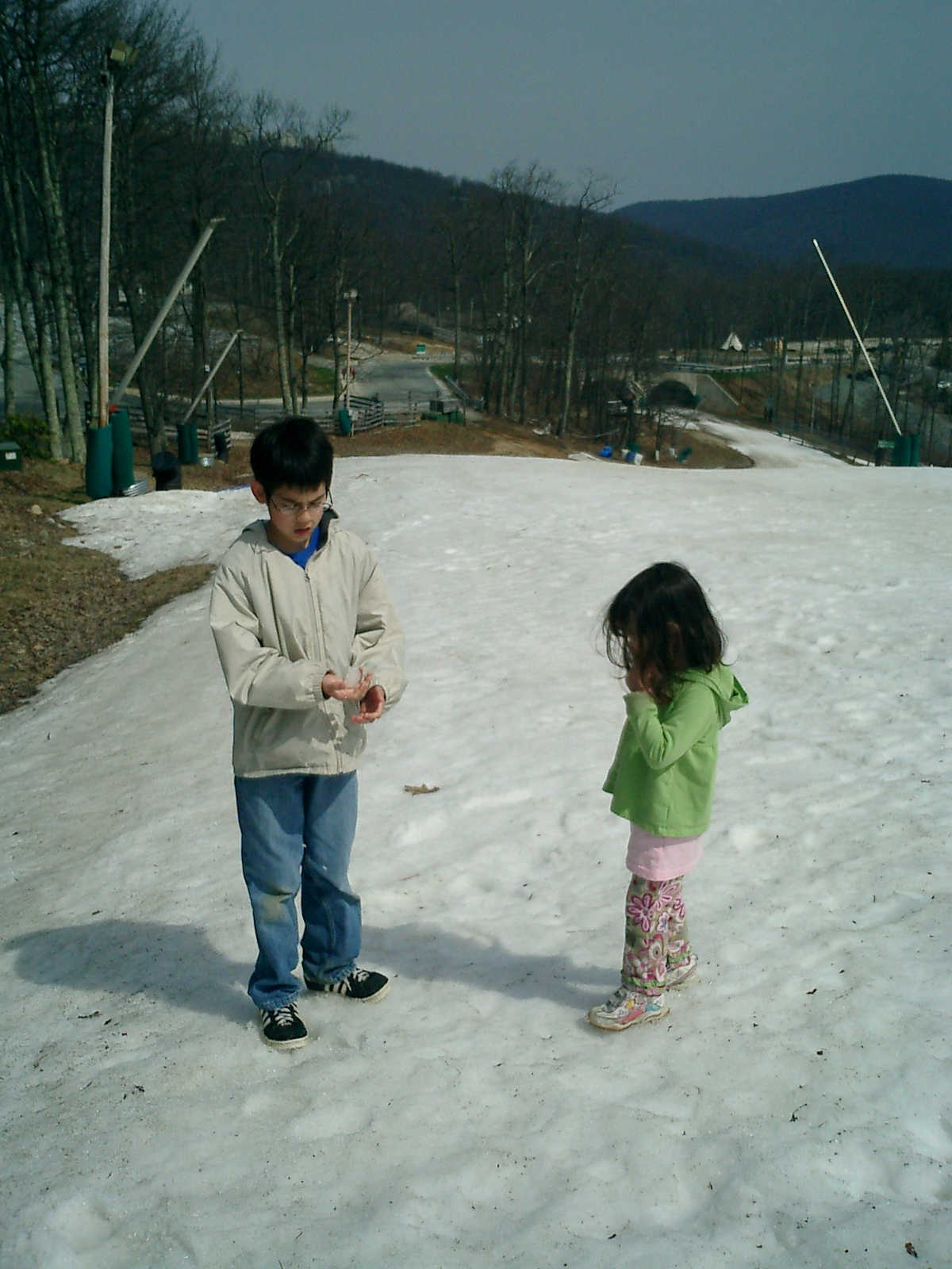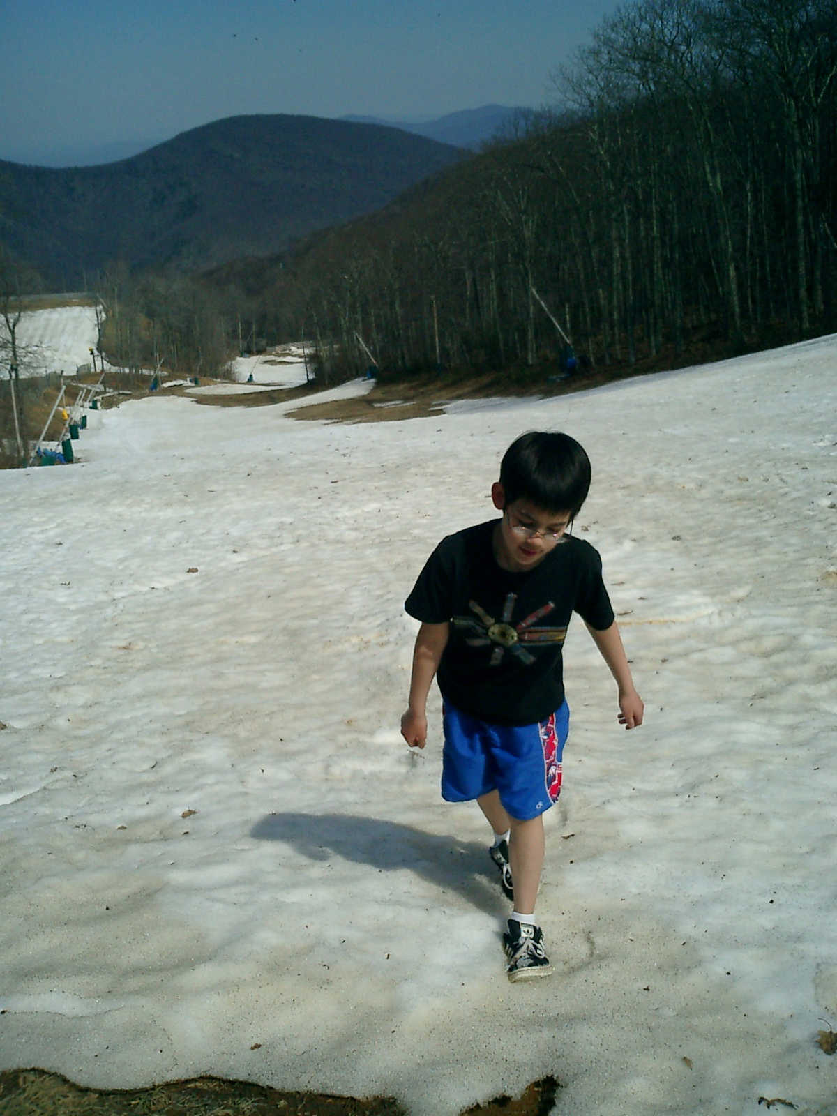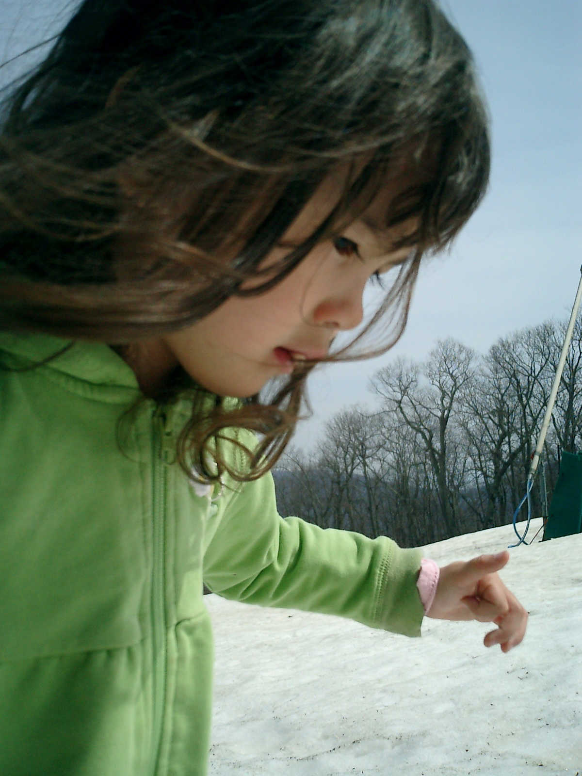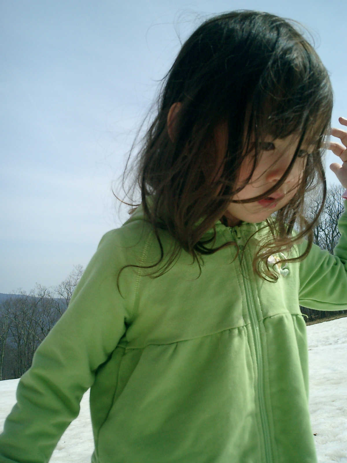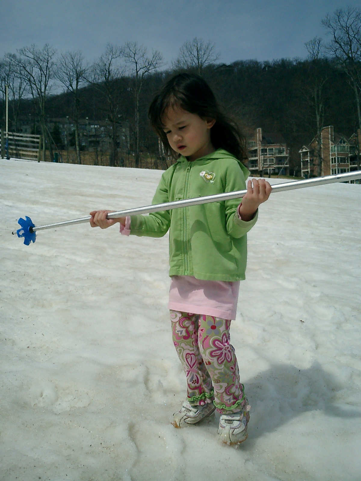 Nadine at 3 years and 4 months (Apr 4, 2010), hiking on the Wintergreen ski slopes, which we discovered were filled with coins that skiers had dropped. We found $10 in quarters, dimes, nickels, and pennies!