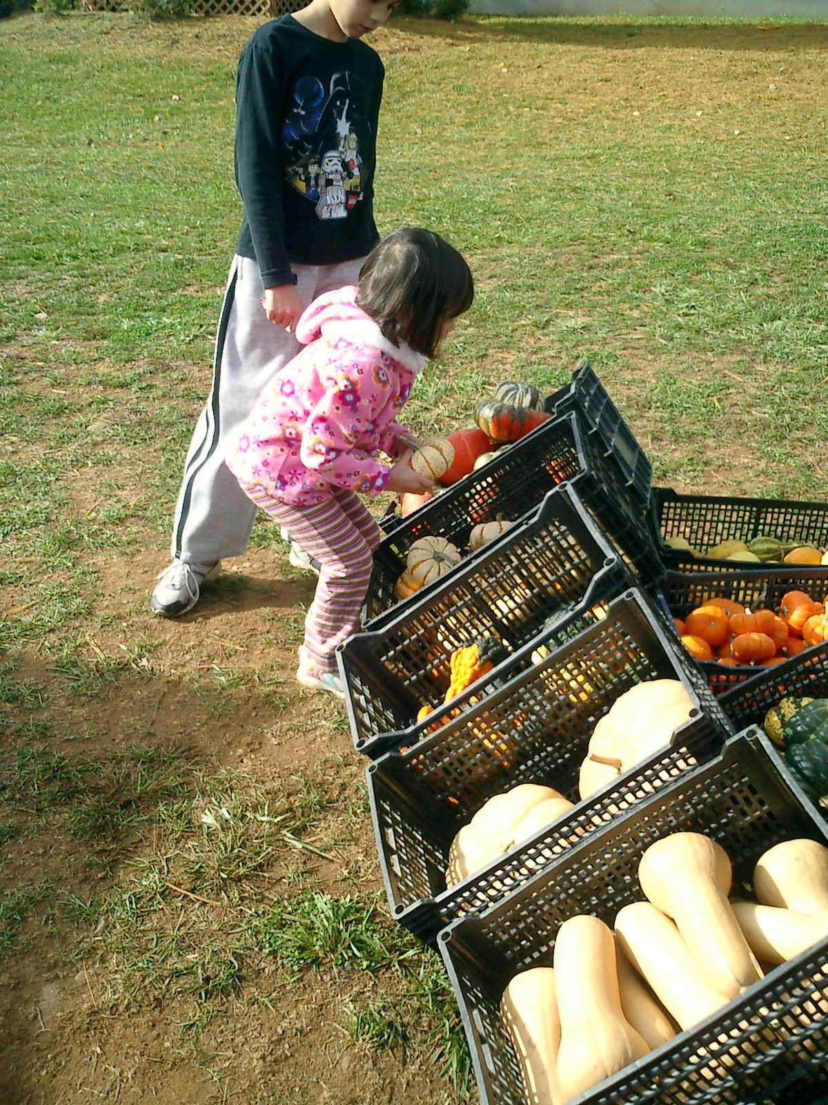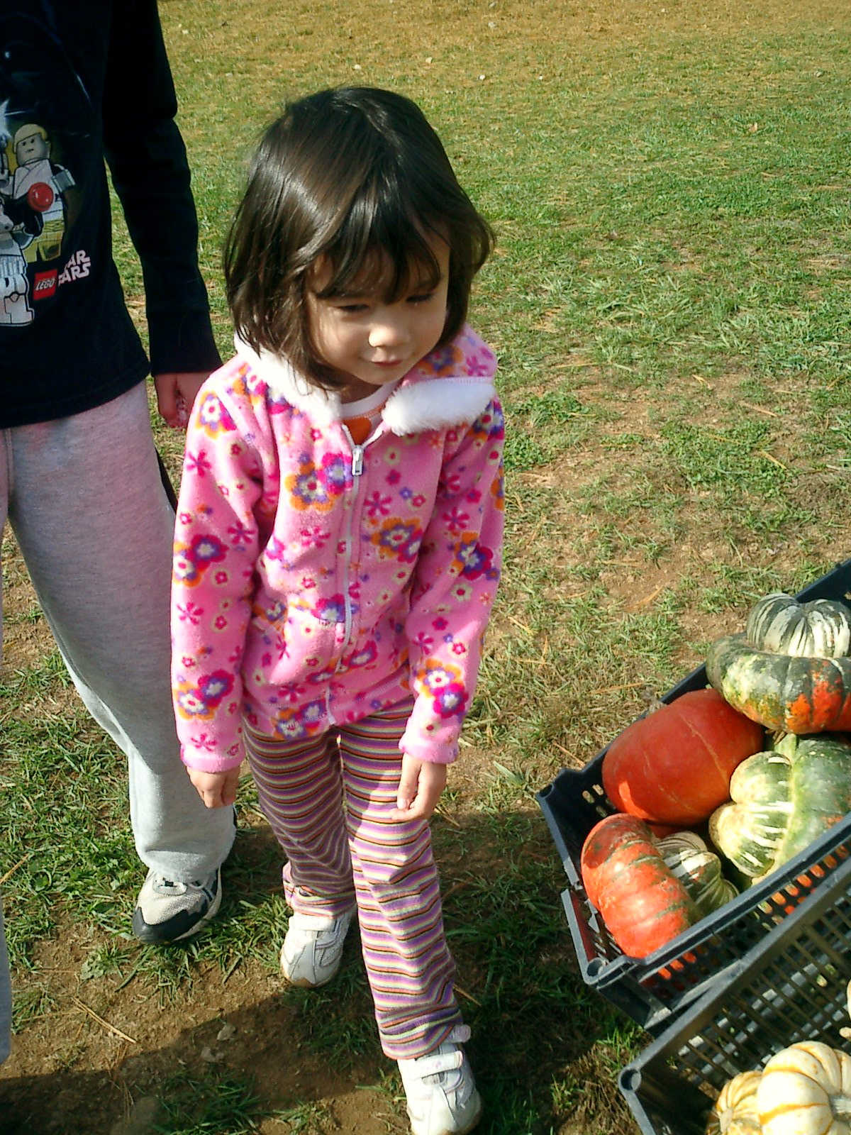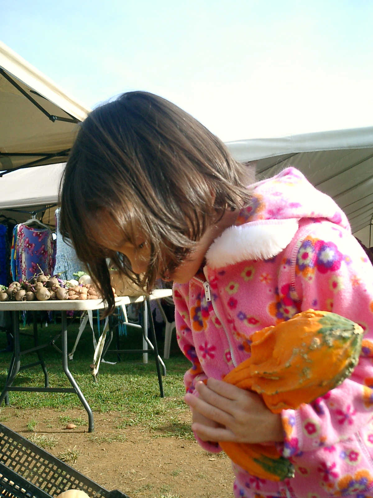 Nadine at 3 years and 11 months (Oct 30, 2010), at the farmers market on Saturday morning. Nadine, you sure love picking up the vegetables and pumpkins, don't you?