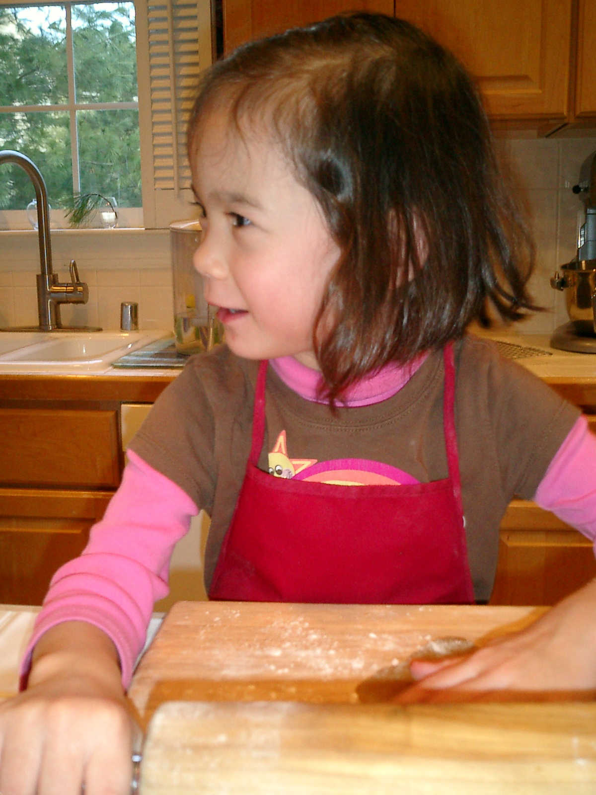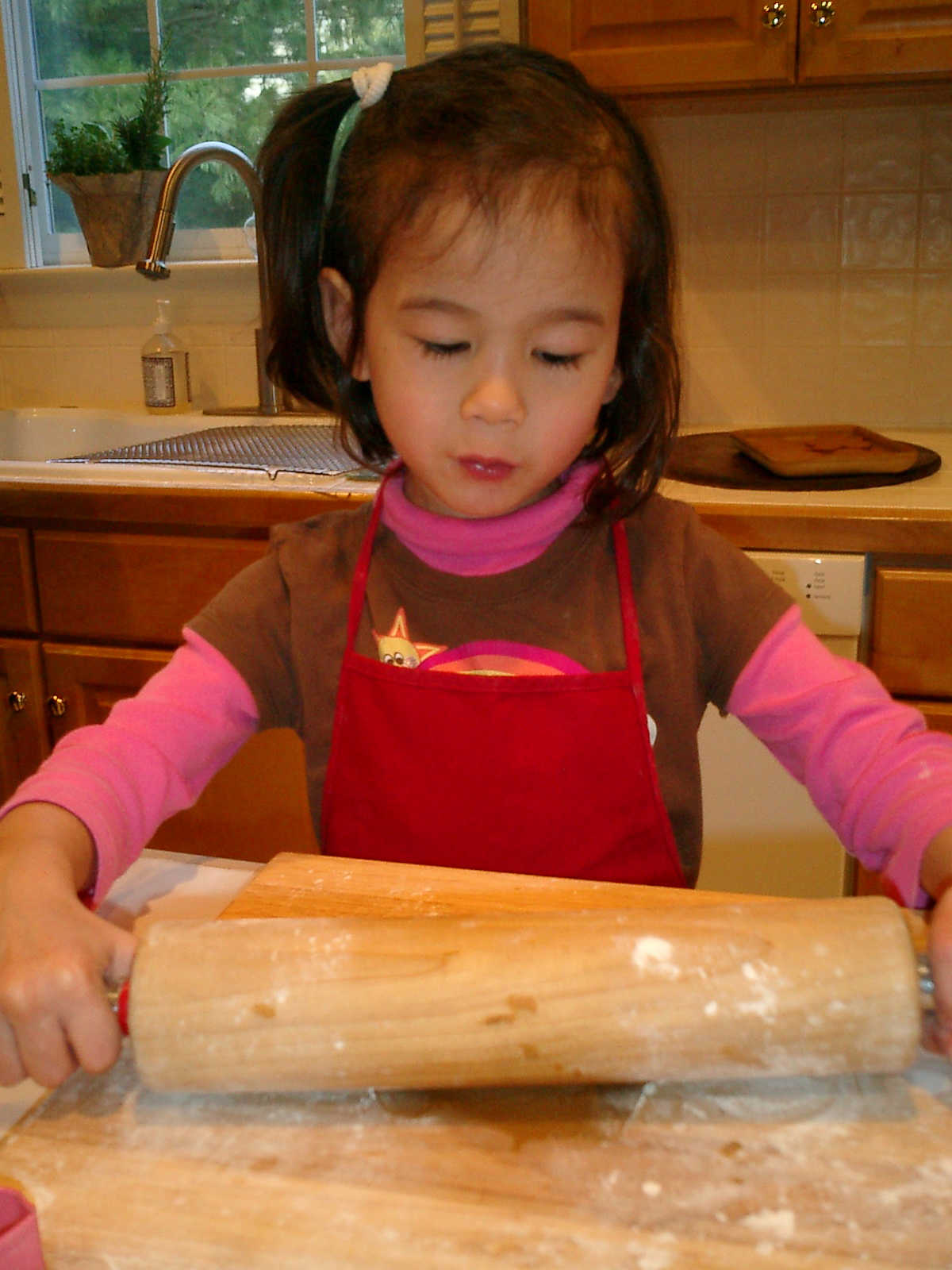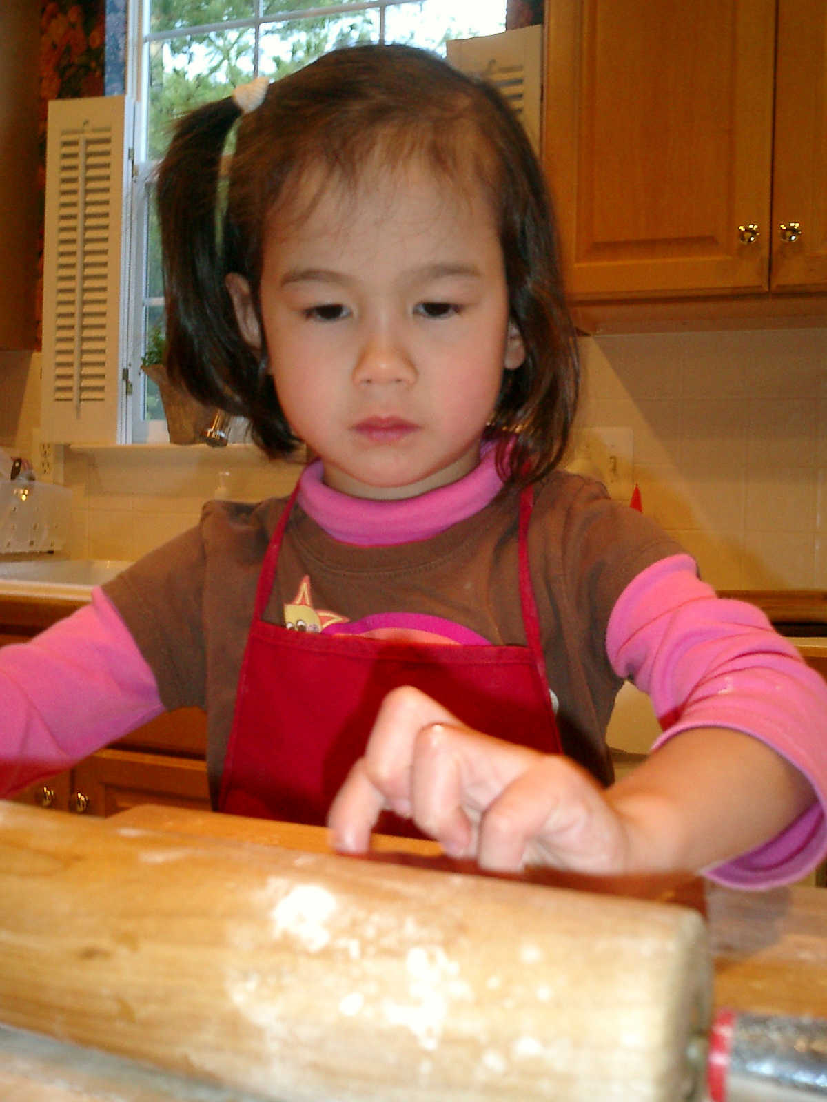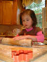 Nadine at 4 years (Dec 5, 2010), helping Mommy make Christmas cookies, for Nolan's postponed Birthday Party, later in the day. You can really roll that dough!