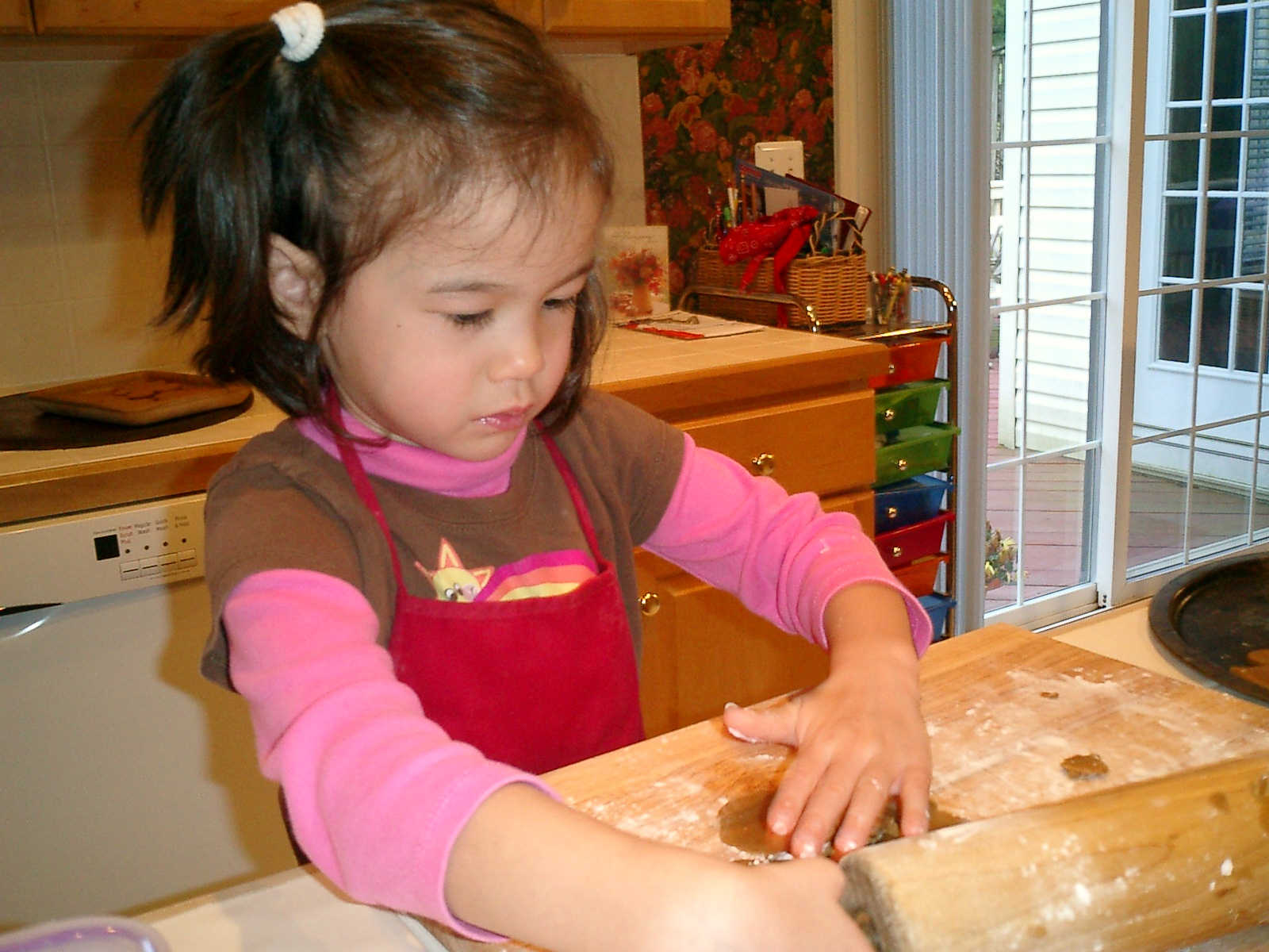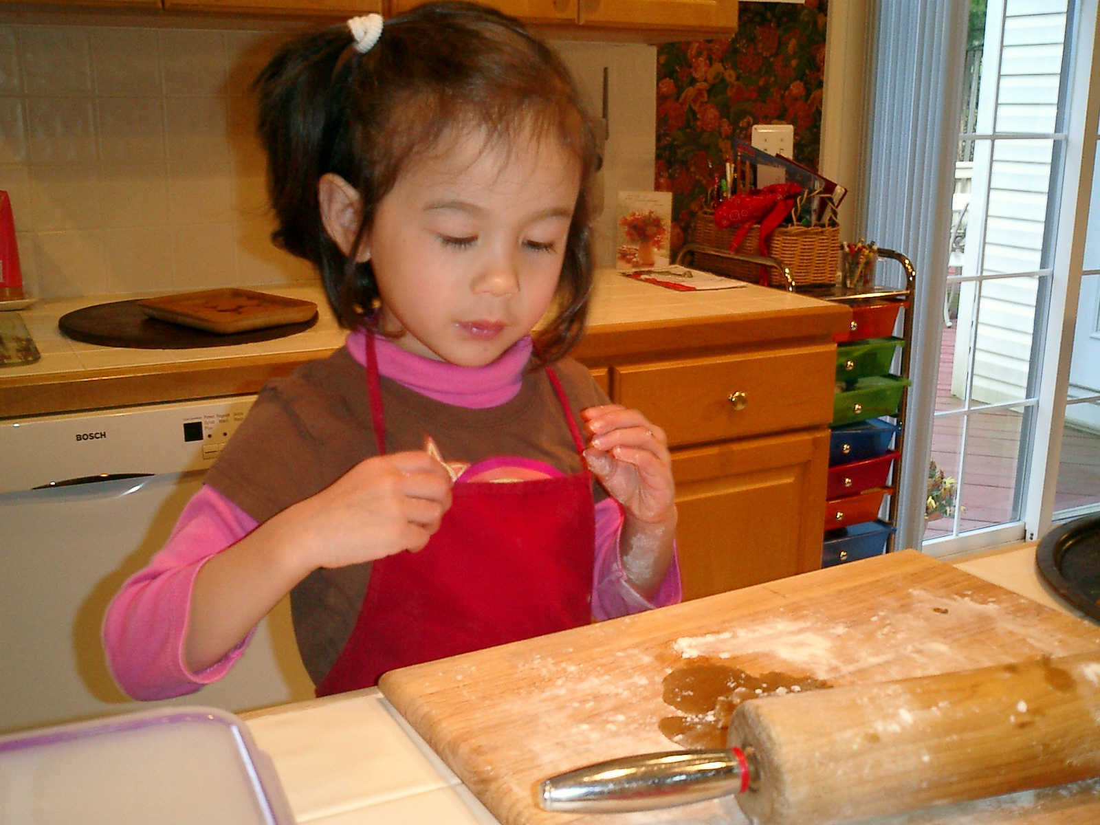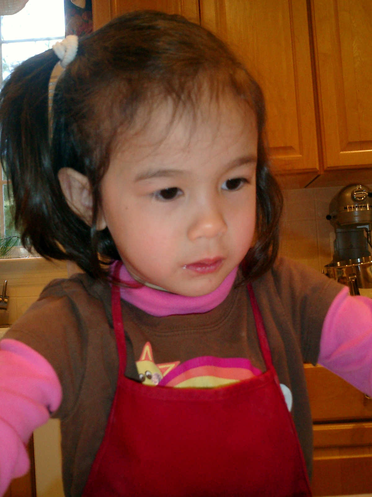 Nadine at 4 years (Dec 5, 2010), helping Mommy make Christmas cookies, for Nolan's postponed Birthday Party, later in the day. You can really roll that dough!