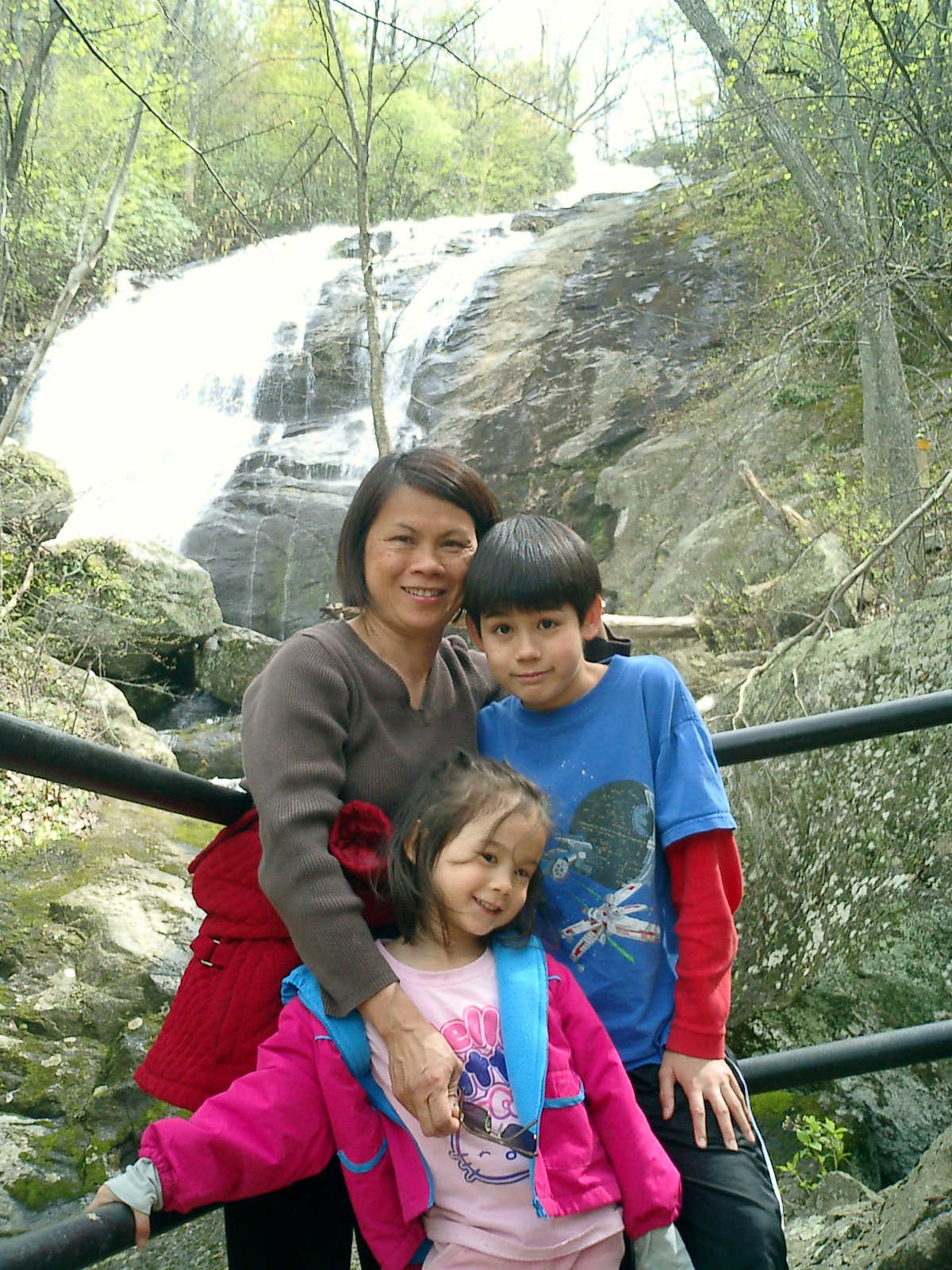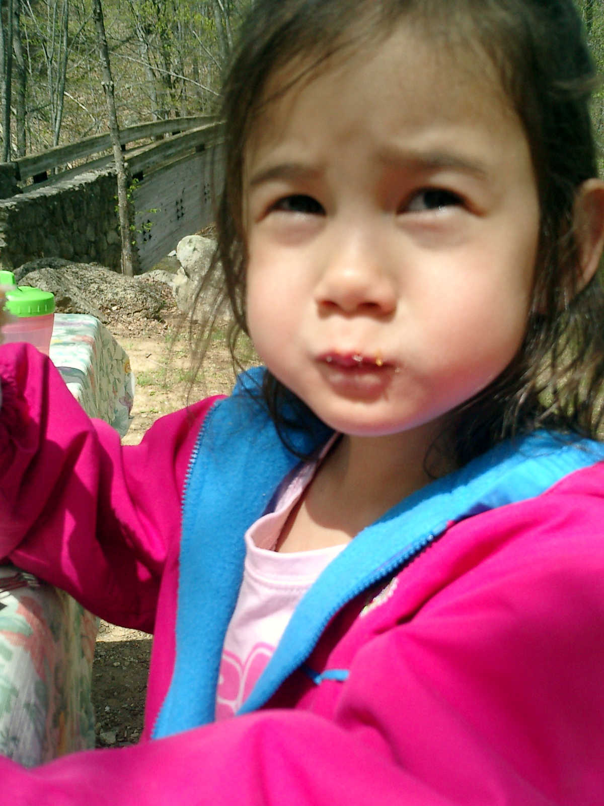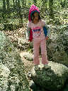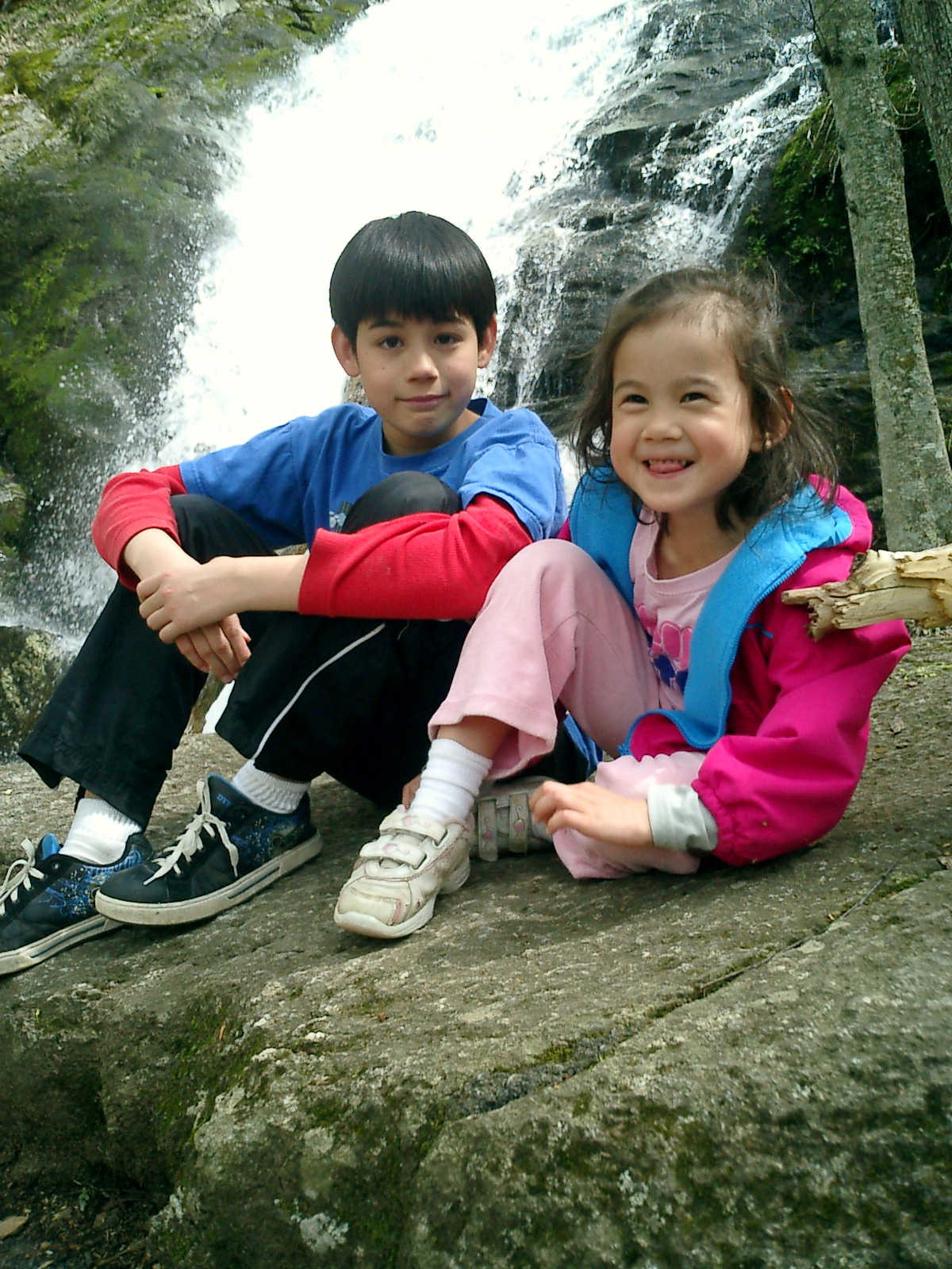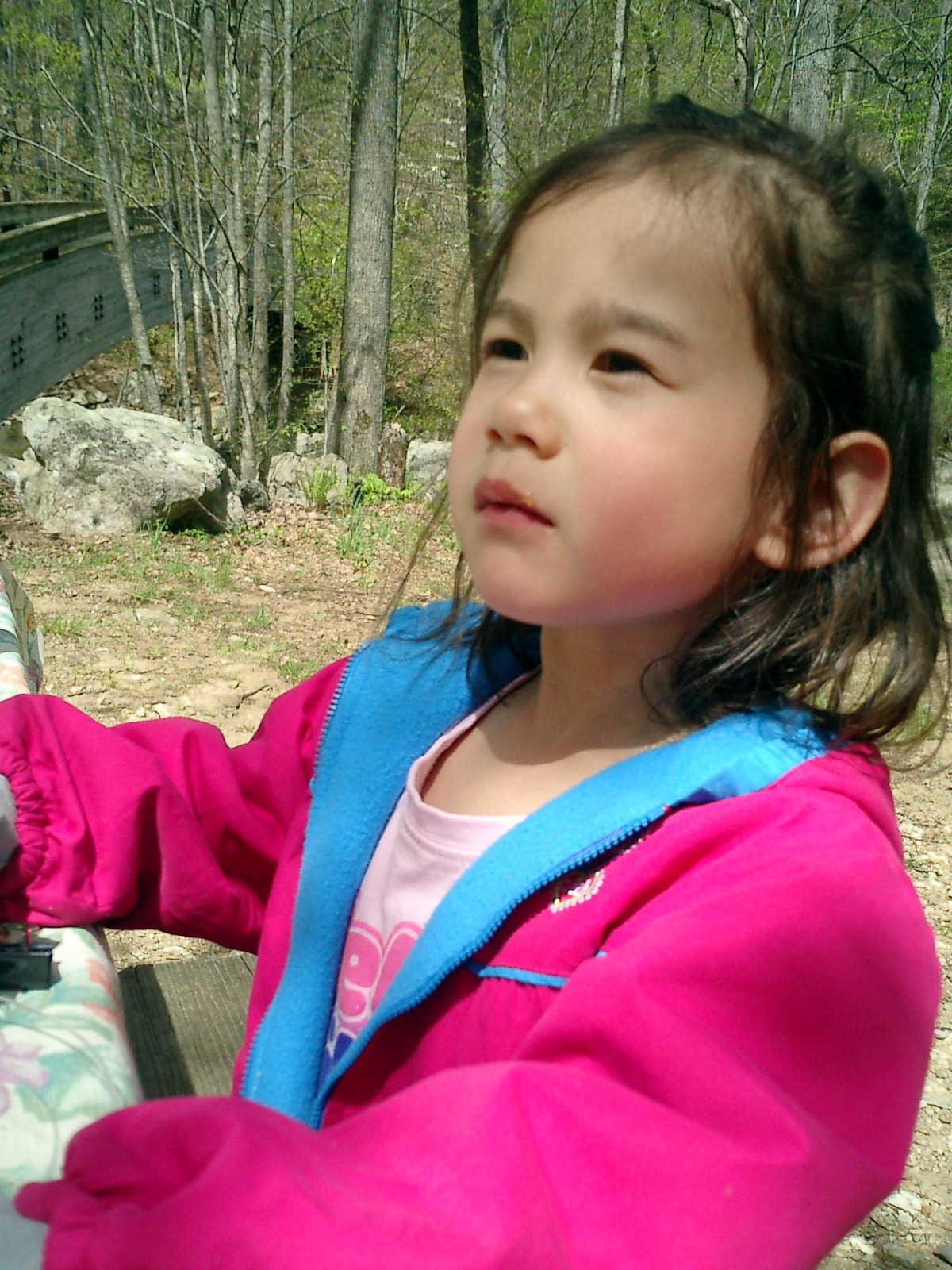 Nadine at 4 years and 5 months (Apr 21, 2011), exploring the waterfalls at Crabtree Falls, Virginia, with Nolan, Mommy, and Daddy. Boy, the recent rain really made the waterfall big!