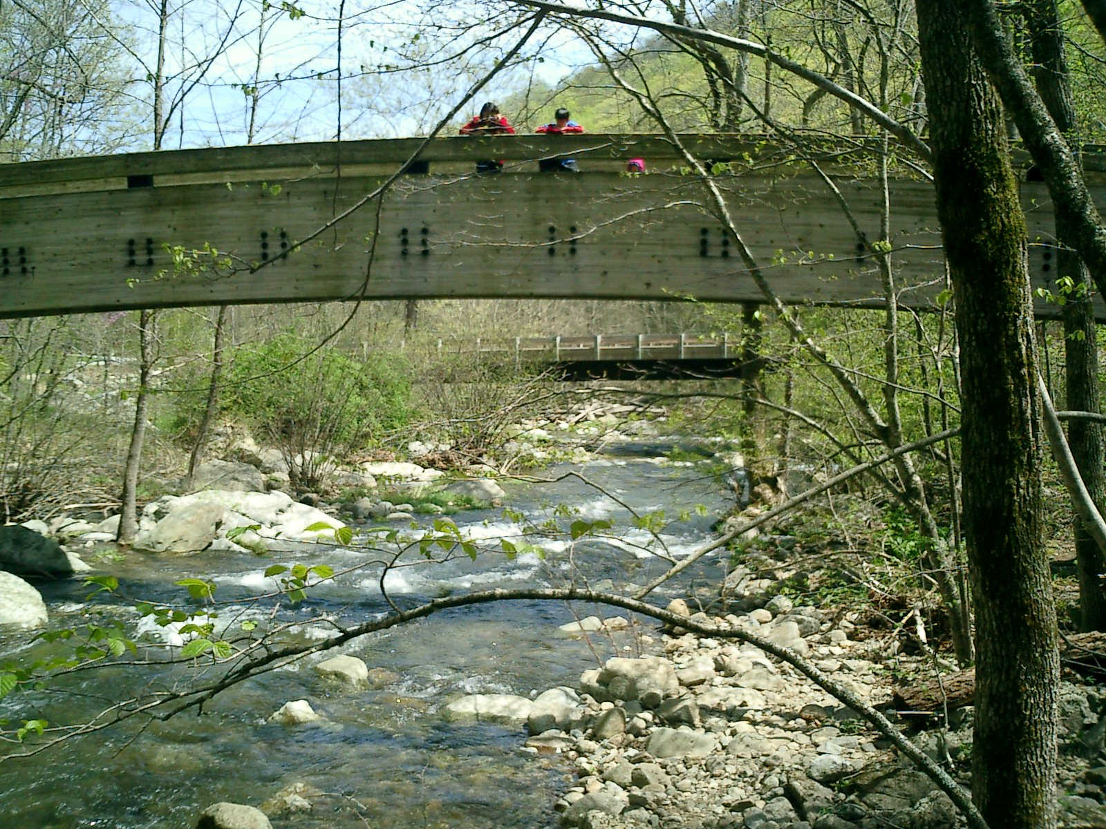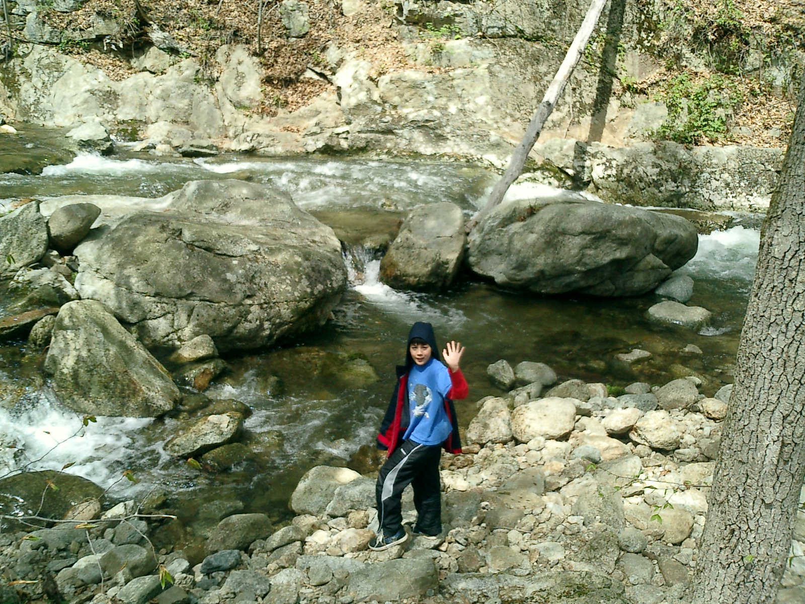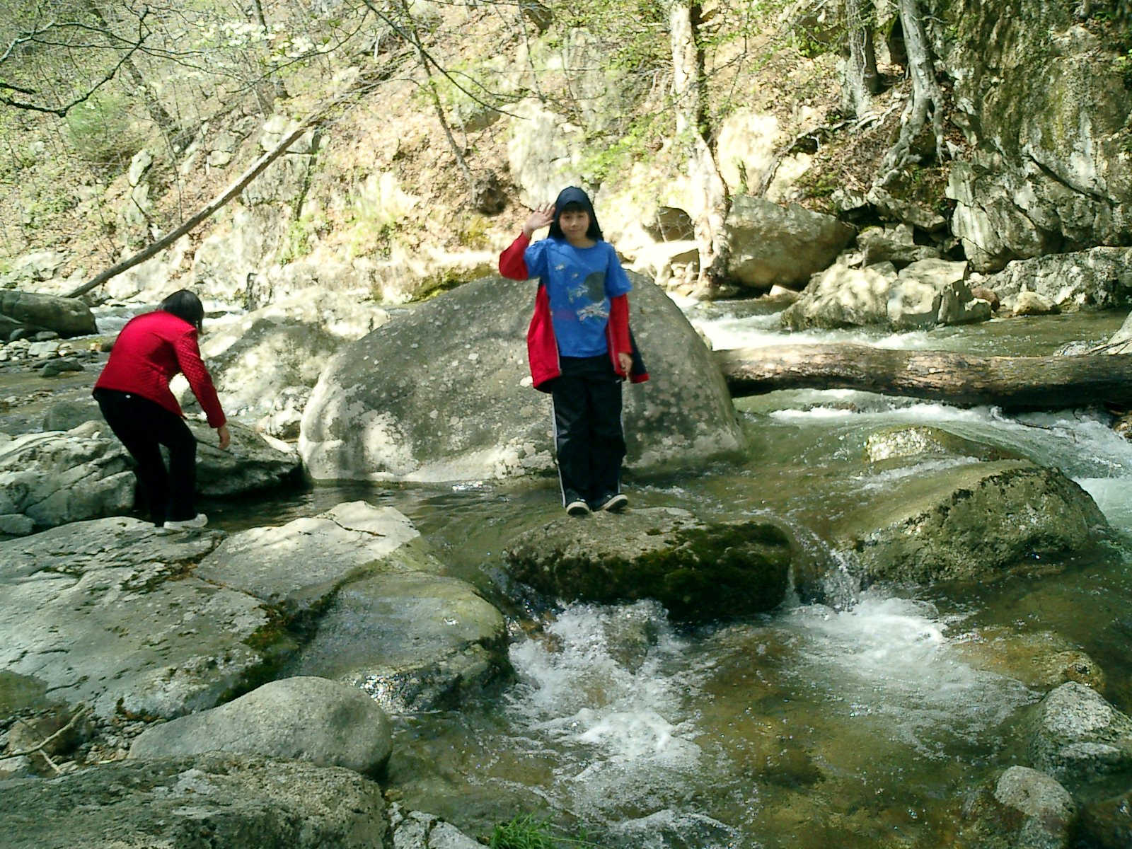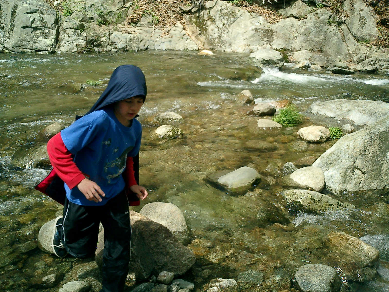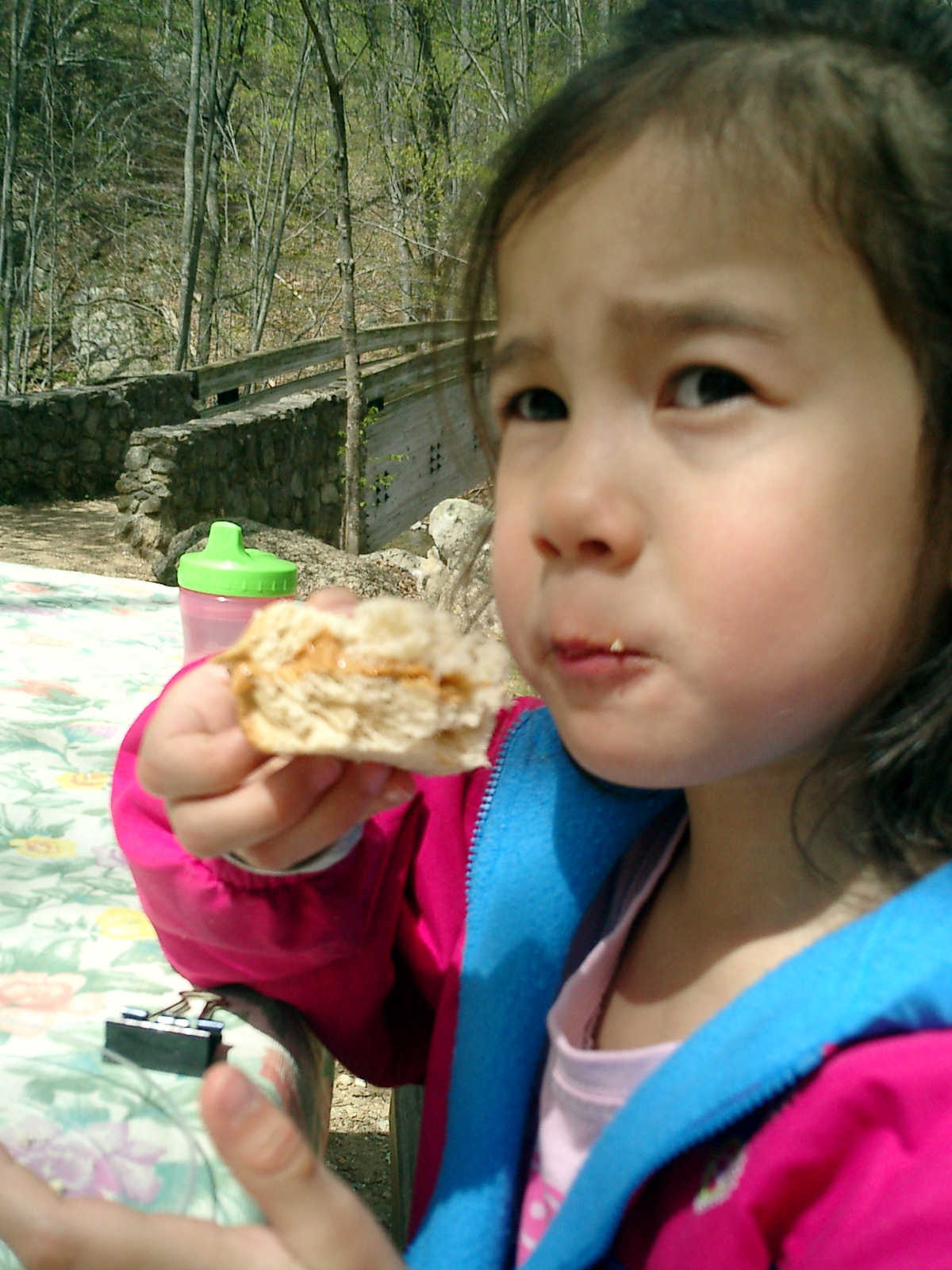 Nadine at 4 years and 5 months (Apr 21, 2011), exploring the waterfalls at Crabtree Falls, Virginia, with Nolan, Mommy, and Daddy. Boy, the recent rain really made the waterfall big!