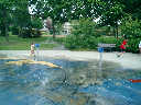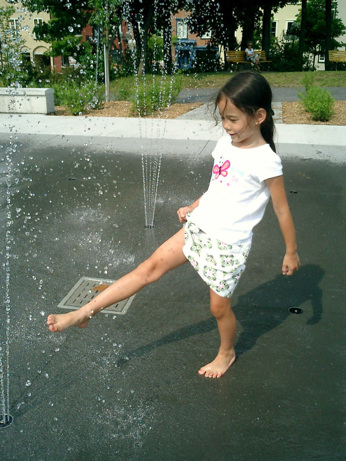 Nadine at 5 years and 8 months (Jul 17, 2012), beating the heat in downtown Quebec City, visiting the fountains and playground water sprinklers too!