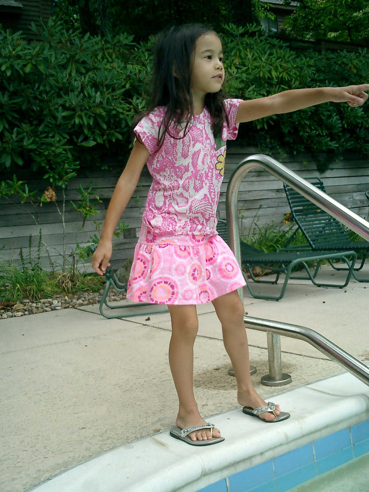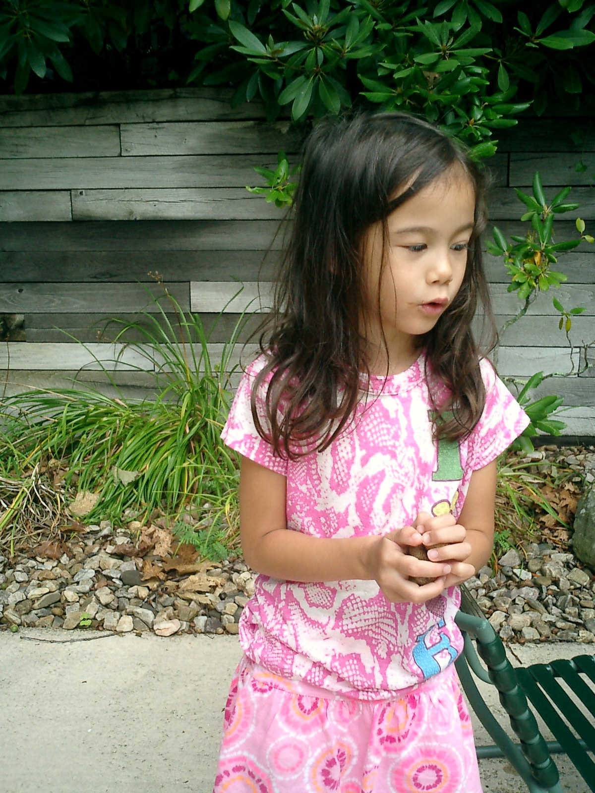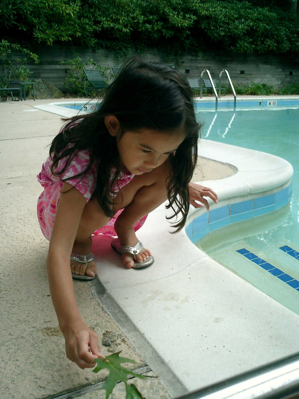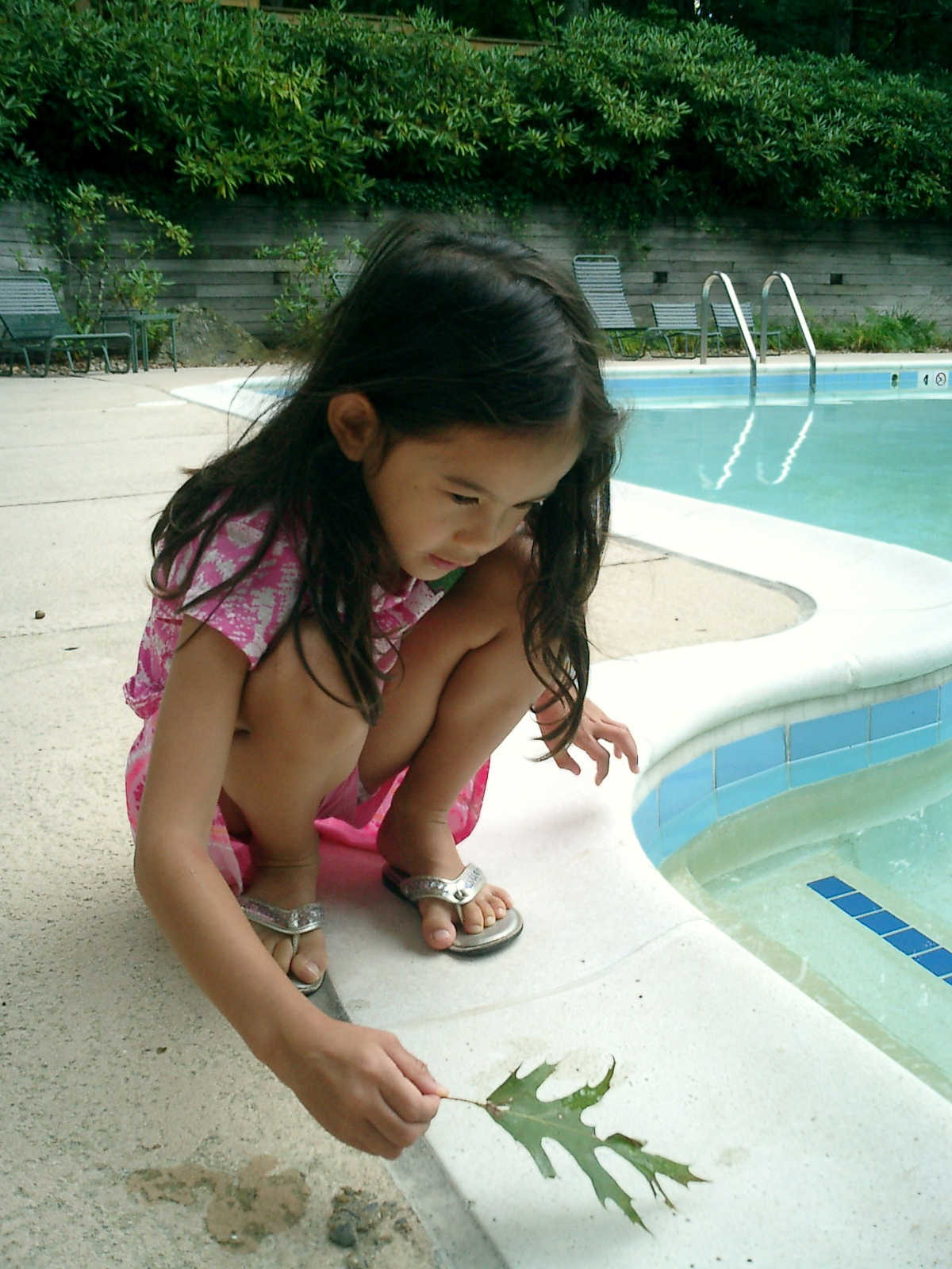 Nadine at 5 years and 9 months (Aug 11, 2012), hanging out at the Laurelwood swimming pool. Nadine, did you make a tiny boat from leaves and acorn shells?
