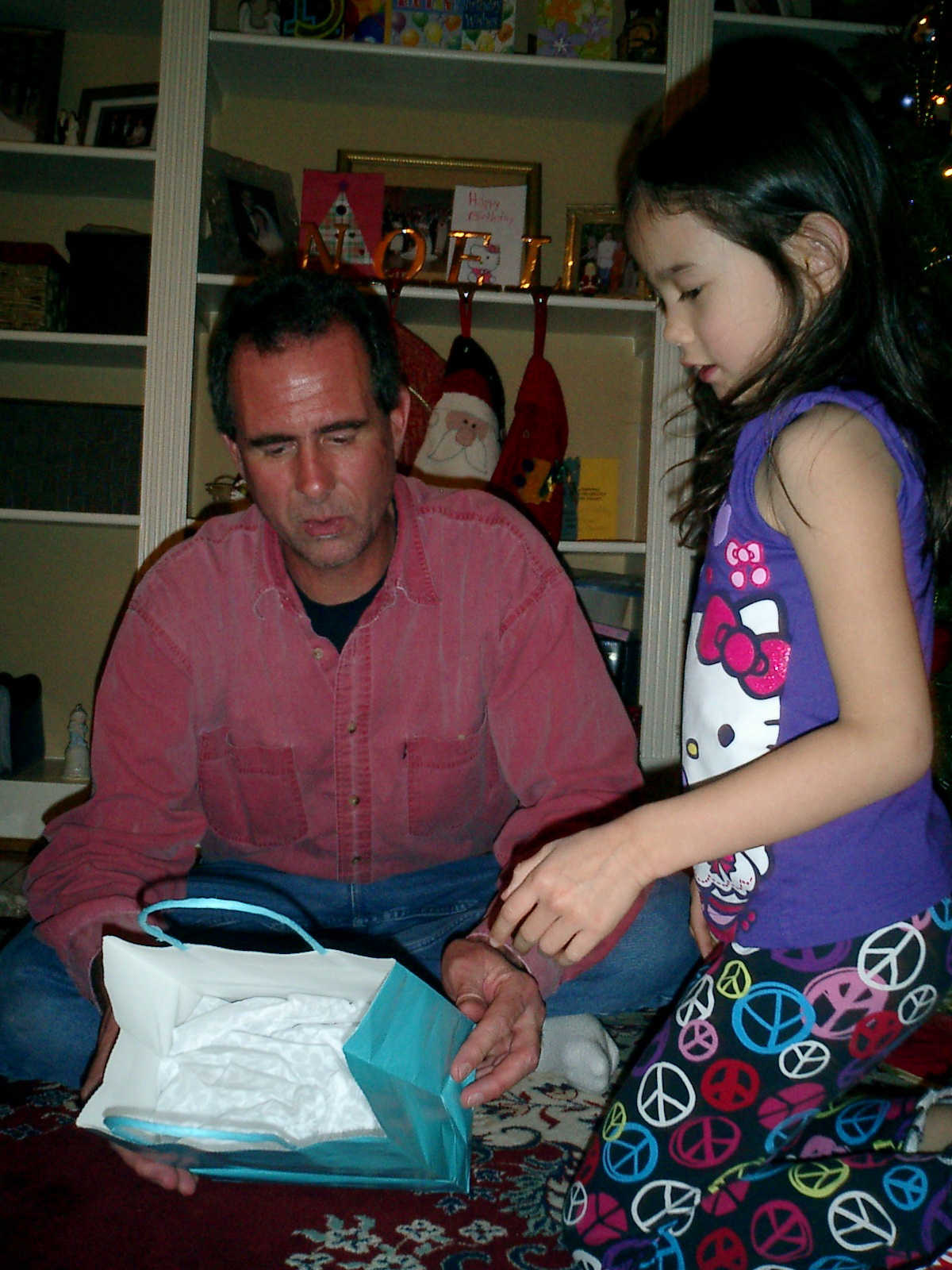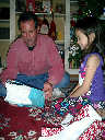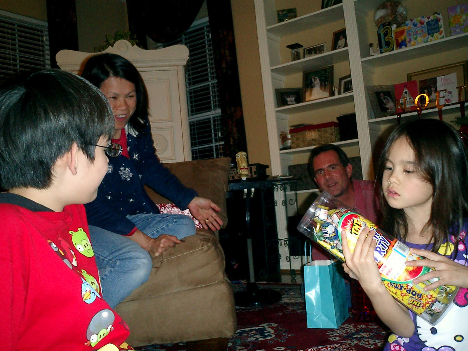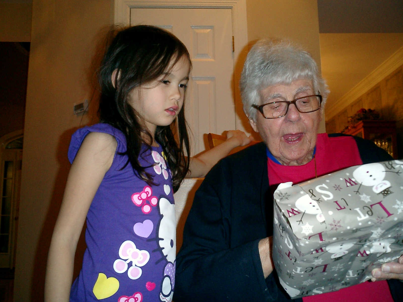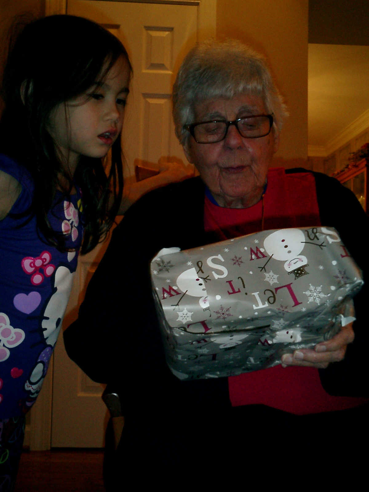Nadine at 6 years and 1 month (Dec 24, 2012), opening presents on Christmas Eve with Grandma Alexander and Uncle Dave. What did Nolan get? Fireworks!