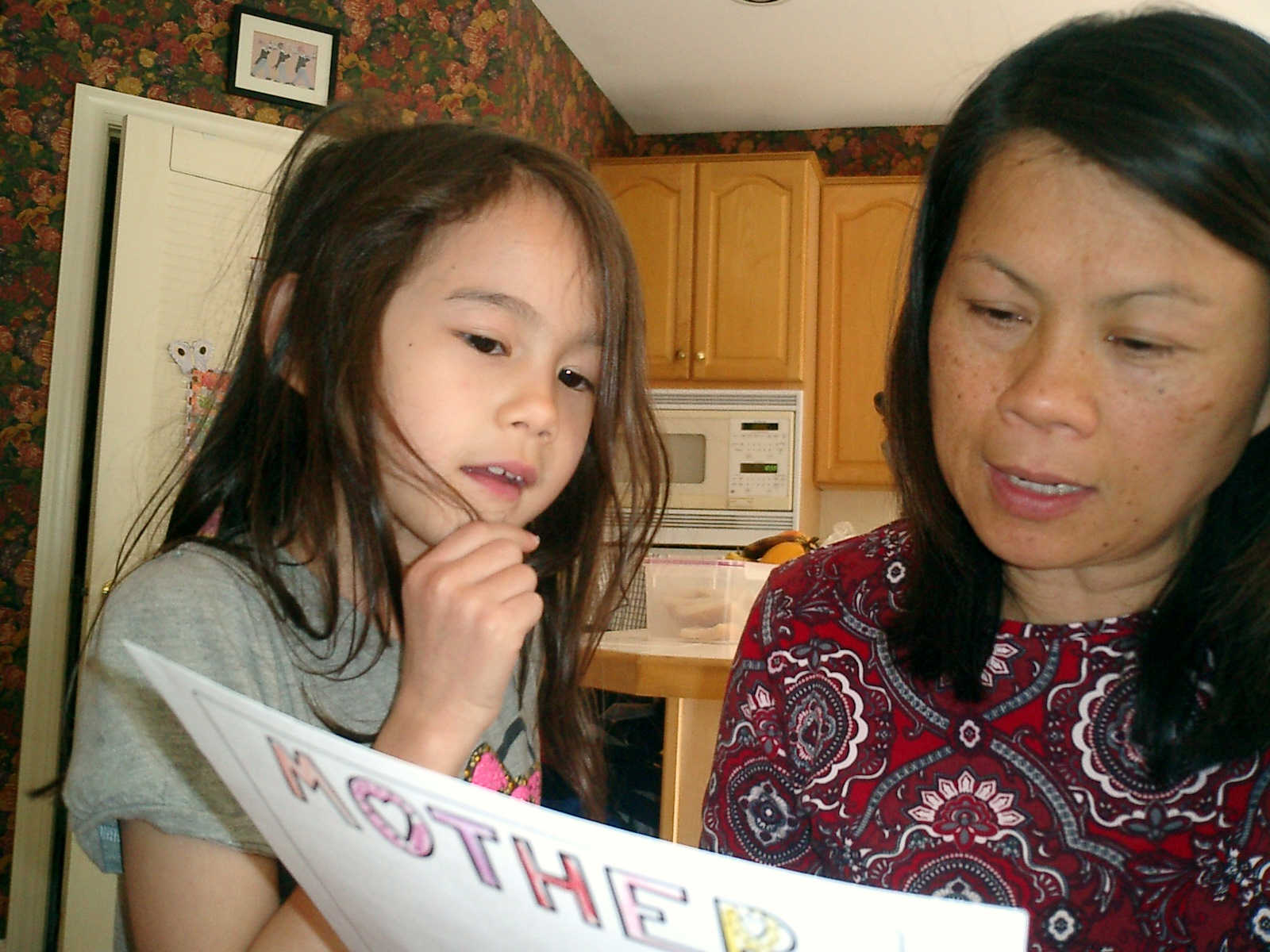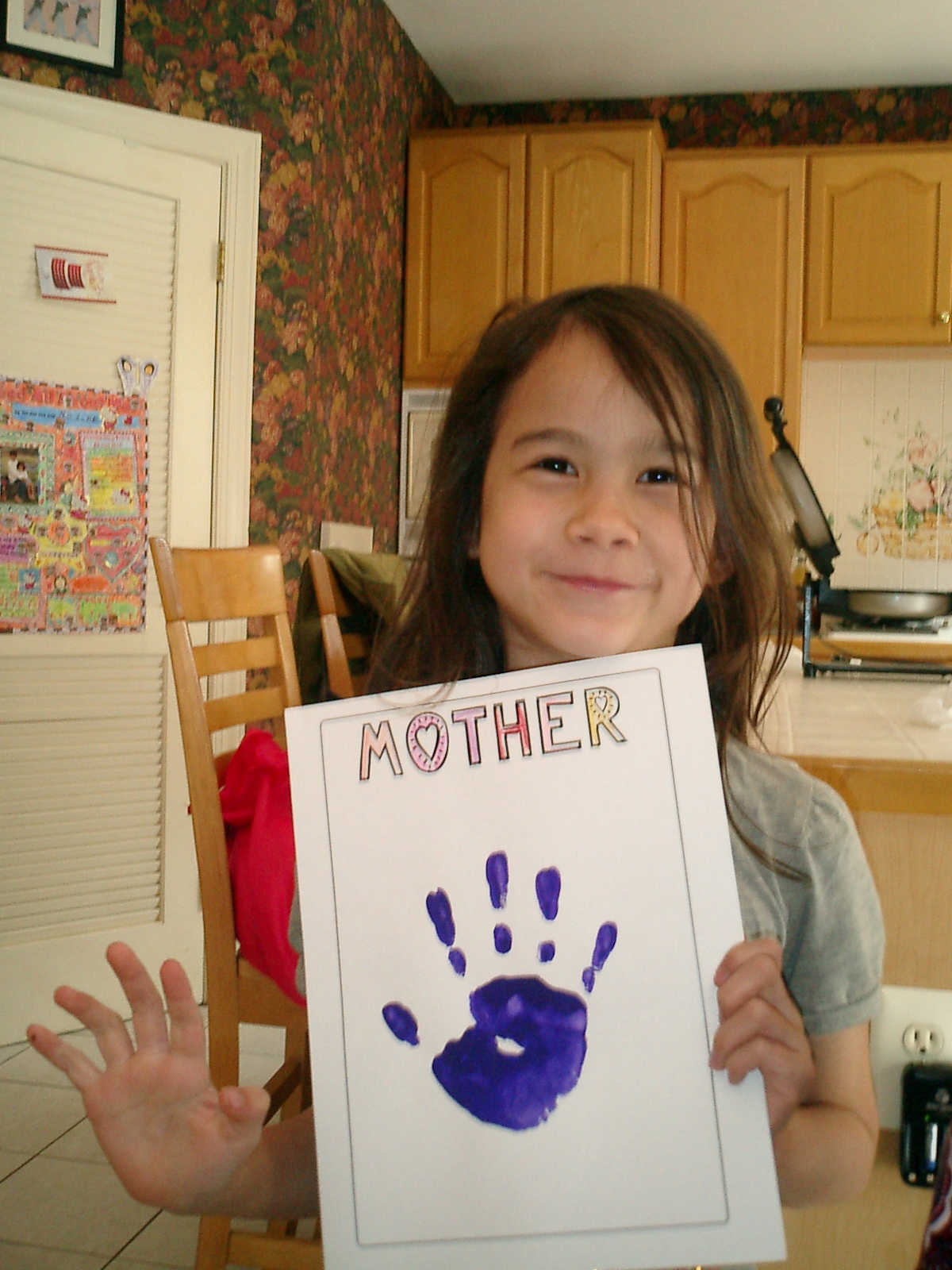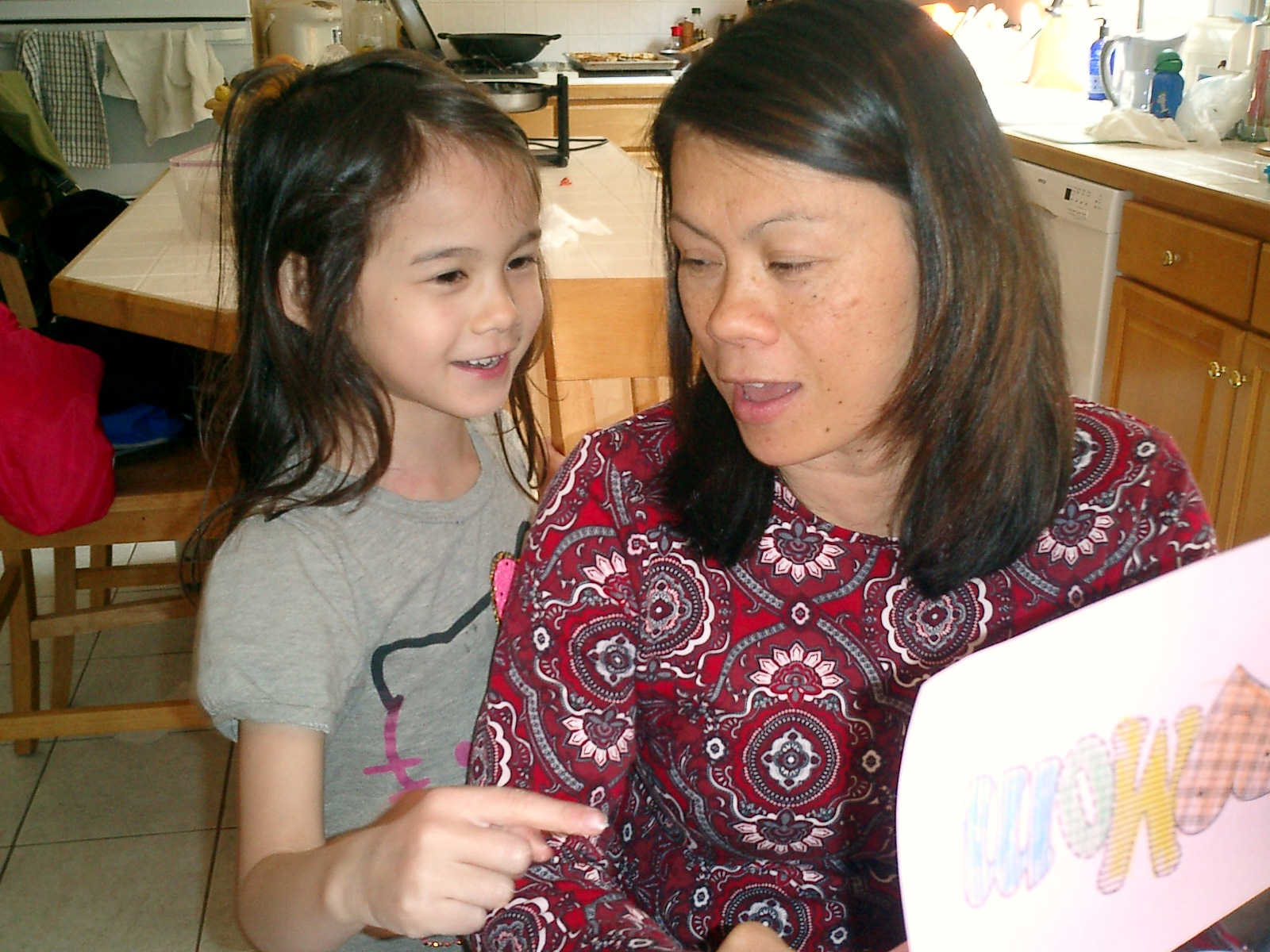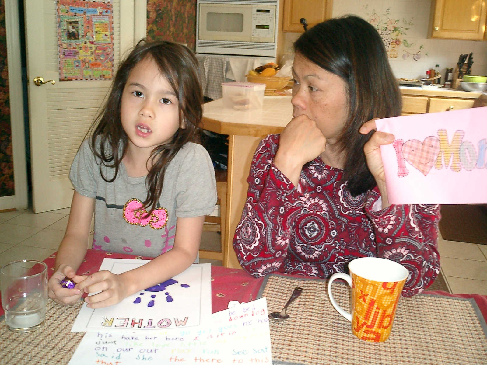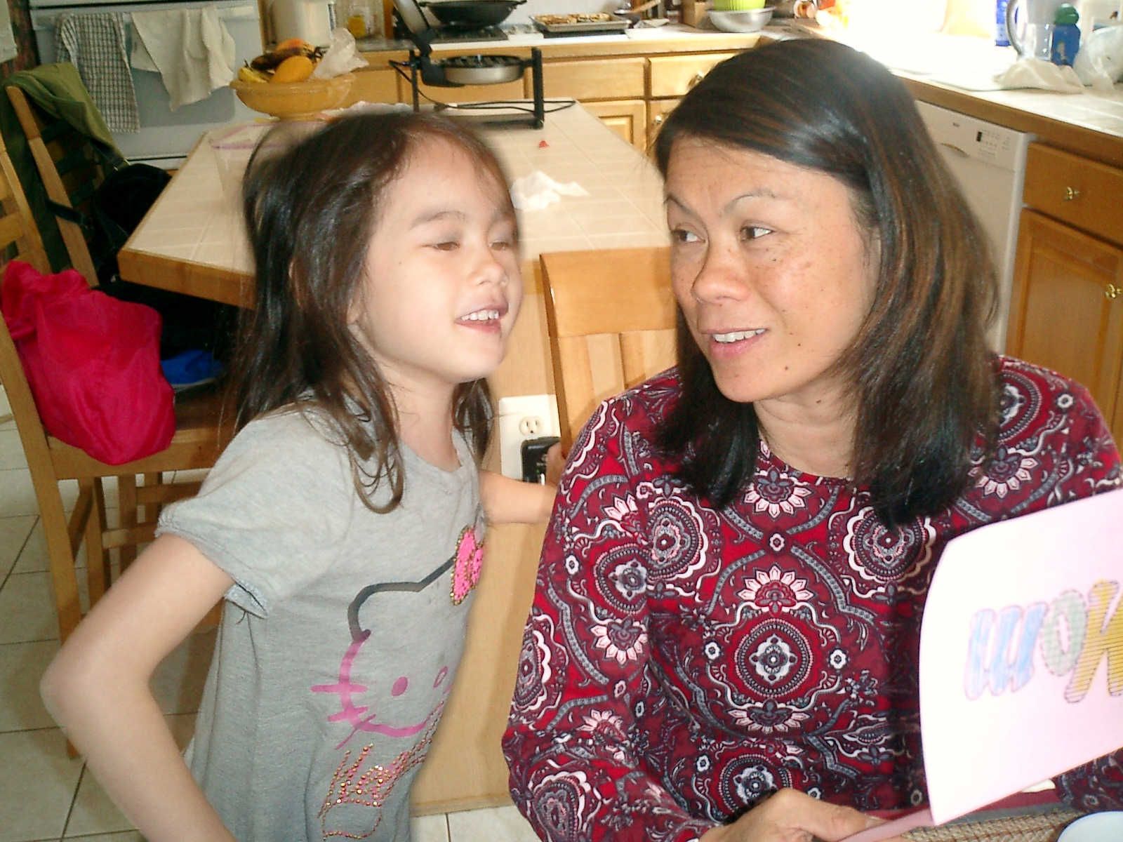 Nadine at 6 years and 6 months (May 21, 2013), giving her Mothers Day card to Sally. Nadine, that sure was a pretty card you made, for Mommy!